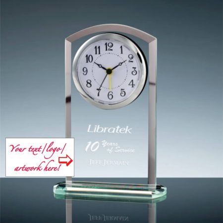 Personalized Crystal Clock, custom engraved with your text, logo and artwork. This clock is modern elegant rectangular shape with an arched top and sits on crystal base. This clock is 3.5" wide, 1.5" high and 5.25" thick.