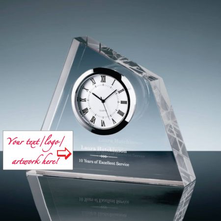 Personalized Crystal Clock, custom engraved with your text, logo and artwork. This clock is the classic iceberg shape. This clock is 5.5" wide, 4.5" high and 1.25" thick.