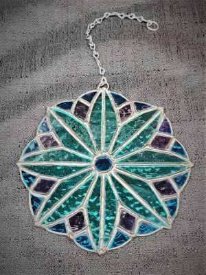Eight Petal Flower in Green, Purple and Blue Stained Glass. This flower has 8 green petals with accents of purple and blue stained glass. It is approximately 7 inches in diameter. Looks great in a sunny window! As usual, this suncatcher is handmade in Rockford, IL.