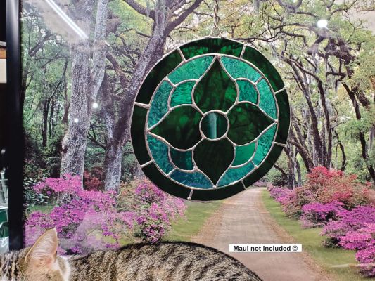 Circular Flower Four Petal in Green Stained Glass. This flower has 4 petals in greens shades in a circle of stained glass. It is approximately 8 inches in diameter. Looks great in a sunny window! It is approximately 7 inches in diameter. I can also make this in any color. As usual, this suncatcher is handmade in Rockford, IL.